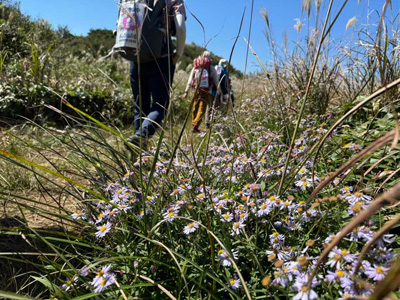 曇り空でしたが、観海アルプスから見える島々が浮かぶ景色は天草ならではと思いました。ズボンとTシャツは手作業で取れましたが、腕カバーは根っこがなかなか取れず苦戦。観海アルプス=(イコール)草チクチク。忘れられない思い出になりました。