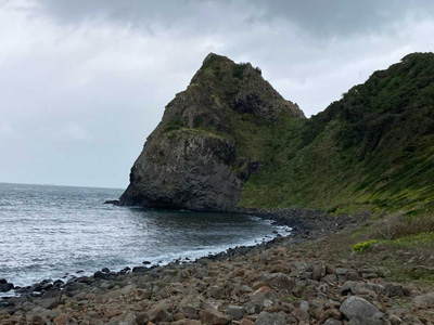 2日目 時間の都合で北部の高舞登山公園→白嶽まで。車2台を下山口の白嶽キャンプ場へデポしてスタート。デポには50分かかるがバスの便が少なくやむを得ず。登山道は九州自然歩道なので階段など整備されて歩きやすく、海や昨日登った次郎丸岳が時折チラッと見えるのに励まされながら歩く。蕗岳(つわだけ)や白嶽からの眺めは期待通り。天気は曇り→小雨。晴れたらもっと海がキレイなはず。夏草か繁りくっつく草の実が蕗岳手前から白嶽まで続きみんなの服にビッシリ。これくらい何でもないと思っていたが結構チクチク。肌にあたると痛い。草の勢いが収まる涼しい時期に歩くのが良さそう。